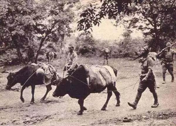 一群日本鬼子赶着两头牛 日本鬼子在侵略中国进村扫荡的时候从不放过每一个角落,见人就杀,见东西就抢。照片中一群日本鬼子扫荡完后,赶着两头从中国农民手中抢来的两头牛,牛背山驮满了各种抢来的粮食。