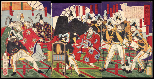 到了1873年,围绕者立刻发动征韩还是等待时机这一问题,政府内部分为两派:一派是苍岩具视、大久保礼通、木户孝允,另一派是西乡隆盛、板垣退助、副岛种臣。两派的争执以一场大政变(西南政变)的发生,西乡隆盛等征韩派退出政府而告终。