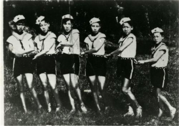 ( 图:1940年9月18日山东八路军五旅国防剧团小舞蹈队表演“海军舞” 左起:于恒嘉、丁敏、朱云芳、宋光华、王丕晓、赵虎)