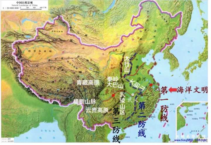 而在近代,由于地理大发现和海洋文明的崛起,中国核心区需要在新的方向上承受压力。这就是东方的海岸线。同样由于中国的三级地理构造,在遭遇全面入侵时,华夏族可以构建三条防线逐级抵抗。理想的情况是守住海岸线,保证国土不遭占领。如第一条防线被突破,则可以沿太行山、大别山和南岭那些山地布设第二条防线。若仍无法防守,则需要退入第二阶地形,以黄河(秦晋大峡谷)、大巴山余脉和武陵山区为依托进行最后的防御。在这种情况下,中国核心区生产力最发达的地区均被入侵者占领。中国在古典时期从未在这个方向上遭受到这种程度的入侵。