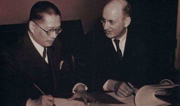 中国财长宋子文(左)和美国财长摩根索签署平准基金贷款协议