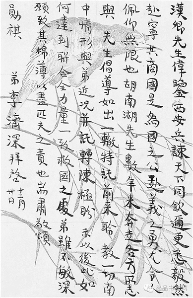 识文: 汉卿先生伟鉴:西安兵谏,天下同钦。迩更悉毅然赴宁,共商国是,为国之公,赴义之勇,尤令人佩仰无限也。胡南湖先生数年来奔走各方,所志与先生倡导如出一辙,特托前来聆教一切南中情形与弟近况,并托转陈,极盼示以后此如何达到联合全力量,一致救国之处。弟虽不敏,深愿致其棉薄,以尽匹夫之责也。专肃,敬颂勋祺。弟李济深拜启。十二月卅日。