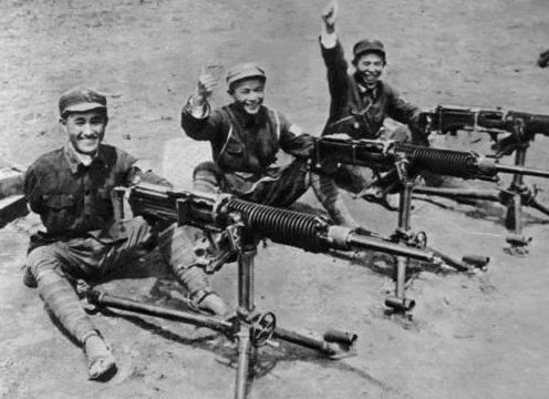 台儿庄大捷掳获的日军机枪。最左边那位 中国军人,手已经断了还是英勇奋战。