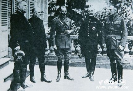 1918年11月7日,德国派出要求停战的代表,翌日到达贡比涅森林的雷通车站。 福煦傲气凌人地对德国人说,你们来干什么?德国谈判代表团团长答道:“想听贵方停战建议。”福煦答:“停战建议?我们没有。我们还有余力,我还想打下去。”